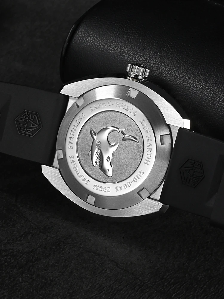 Case Back: Screw Case Back, Deep Press Pattern 3D Shark Logo