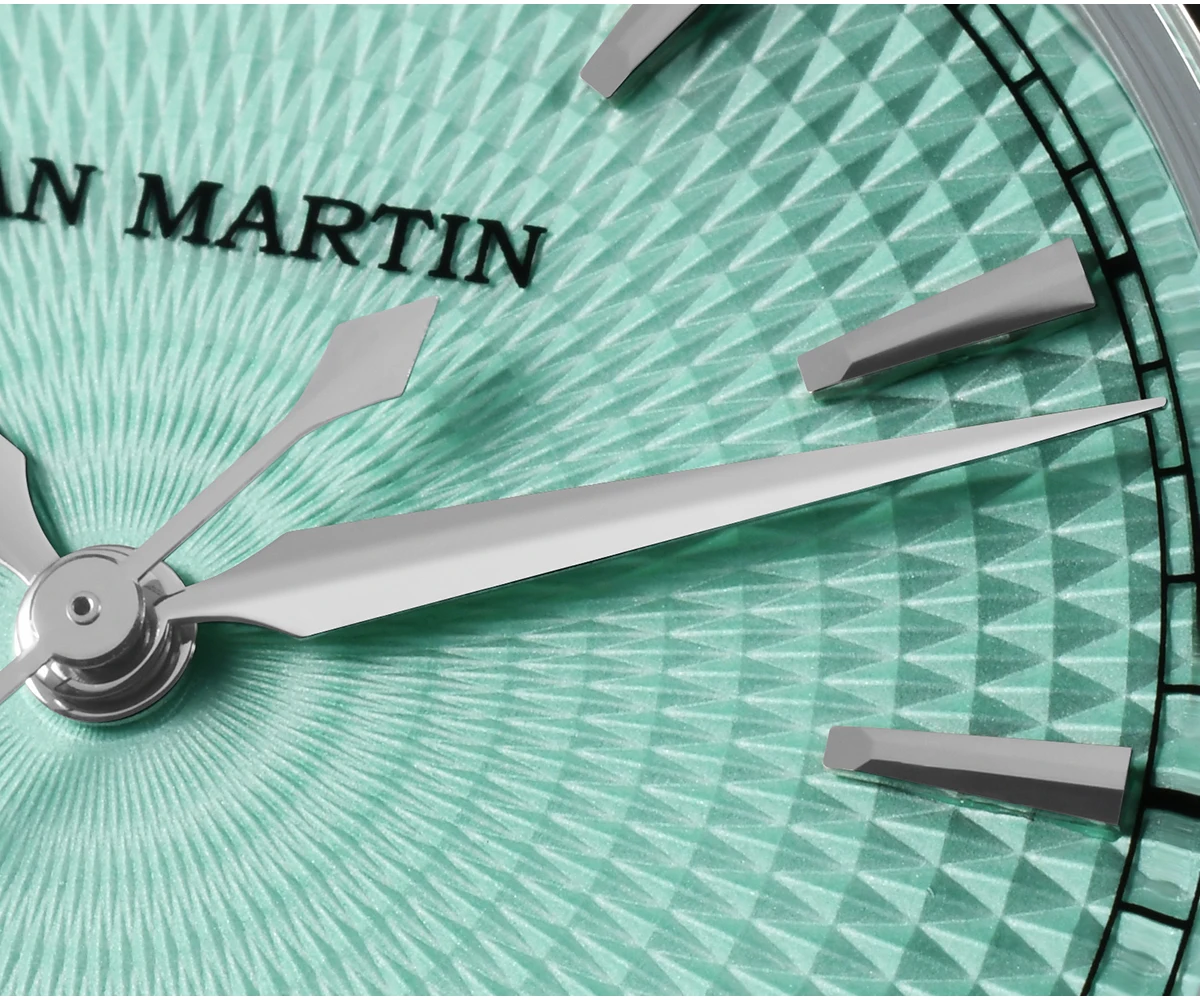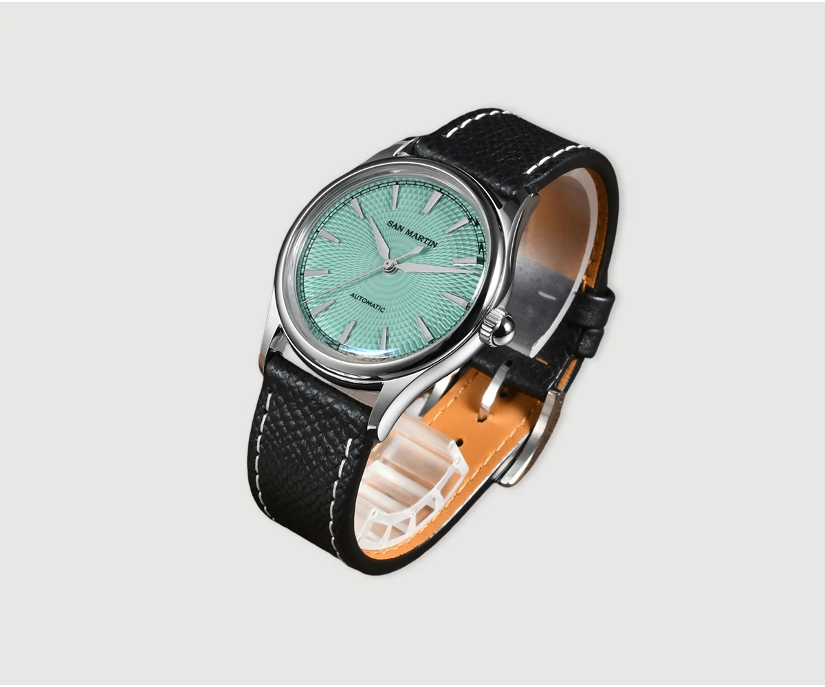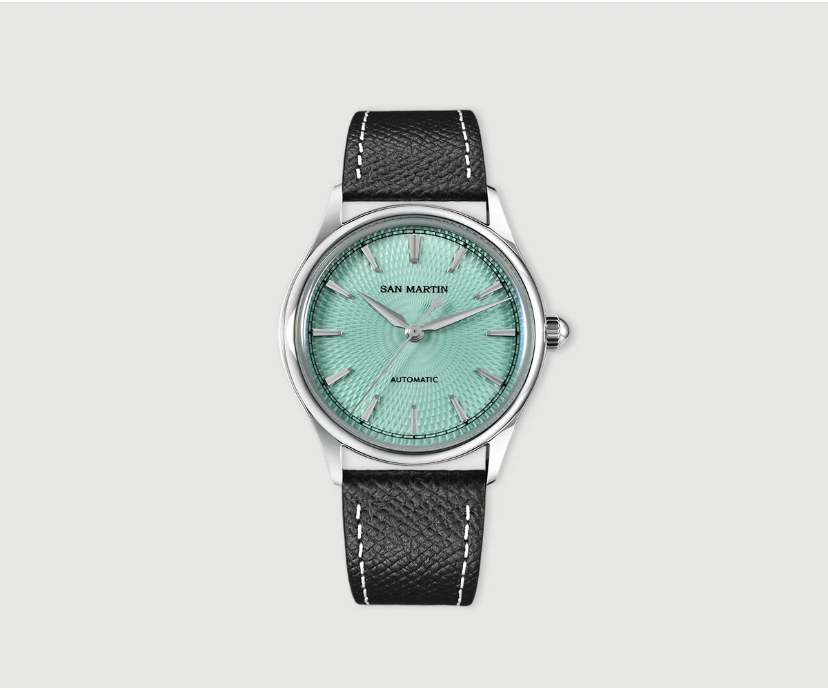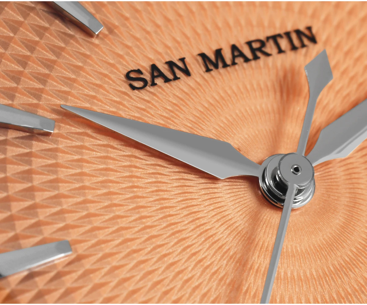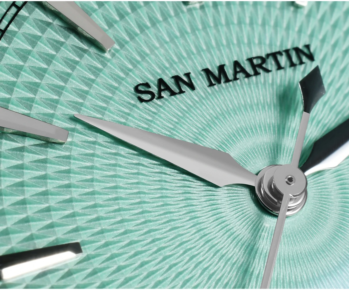 Dial Color: Diamond-patterned dial with enamel coating, Mint Green, Salmon, printed San Martin letter logo
