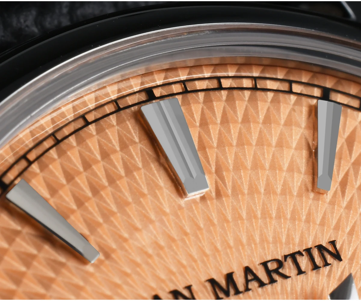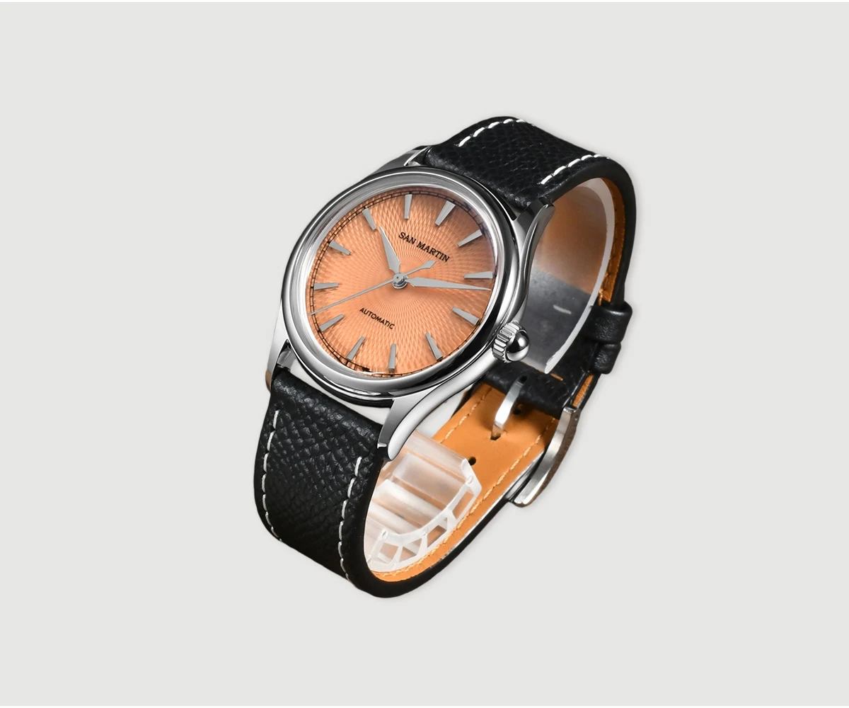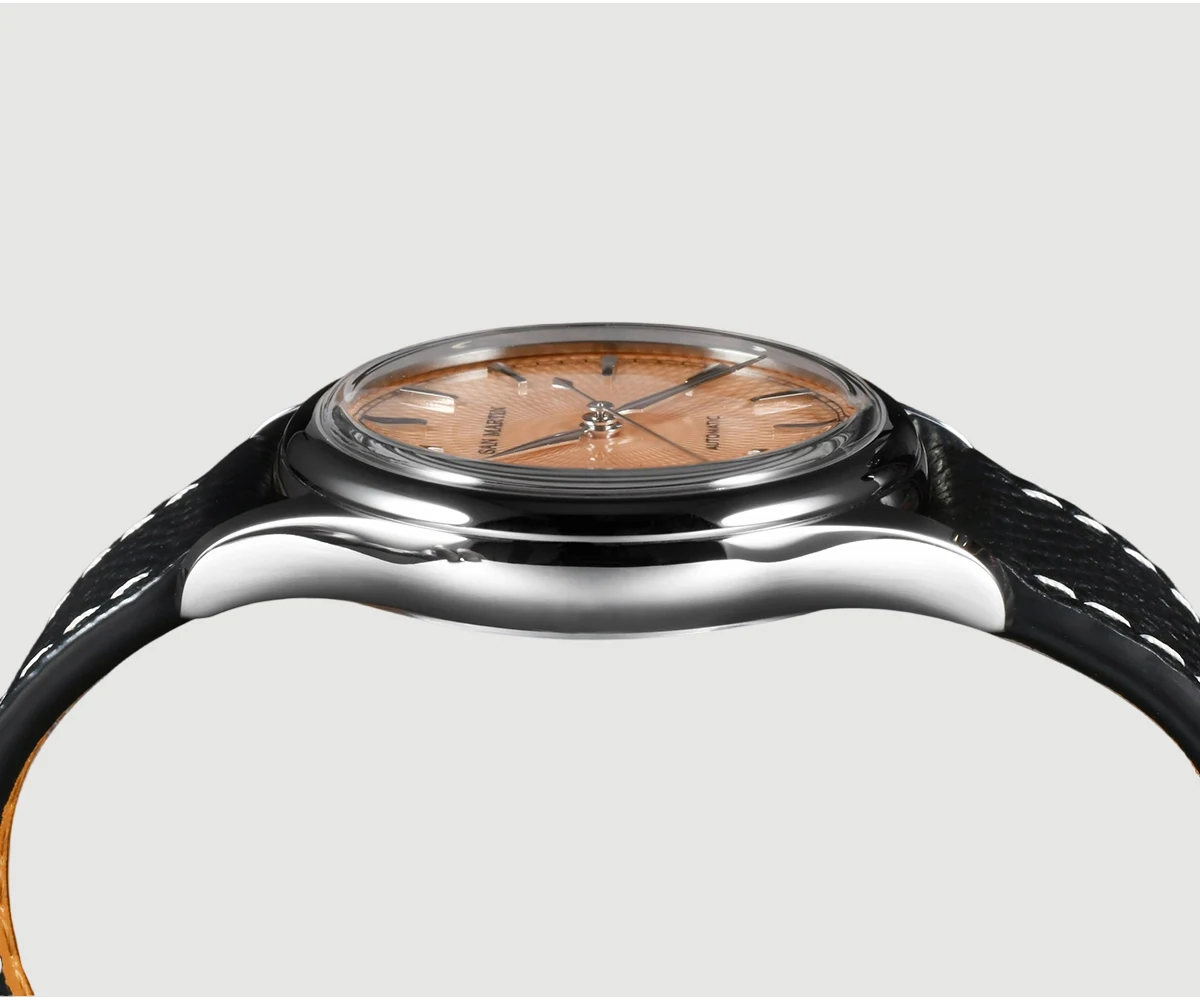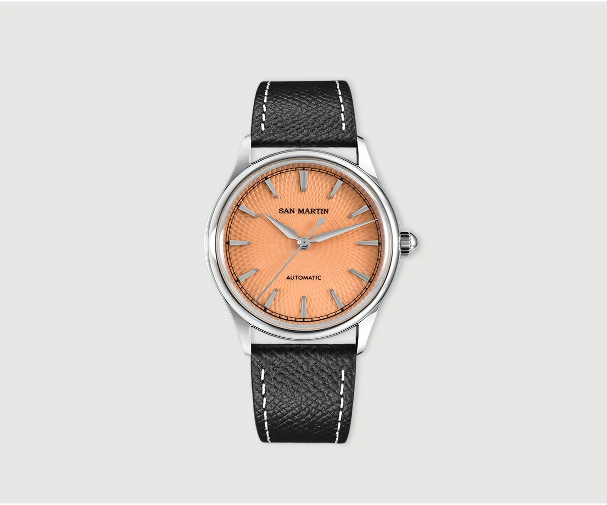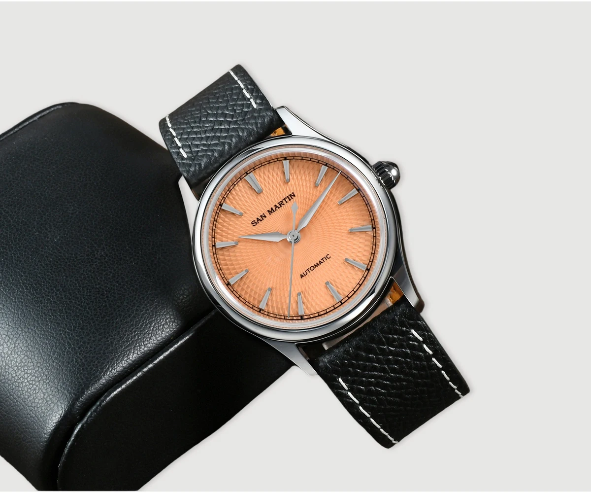Dial Color: Diamond-patterned dial with enamel coating, Mint Green, Salmon, printed San Martin letter logo