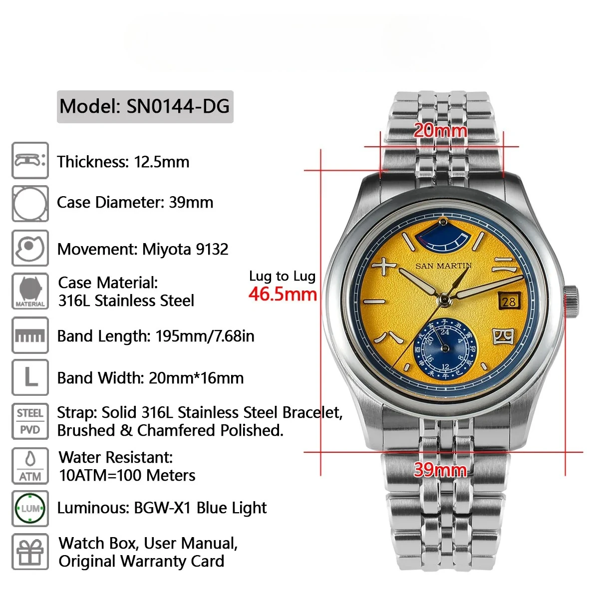 Printed SAN MARTIN Logo, Applied Chinese Character Indices, Date Window at 3 O’clock