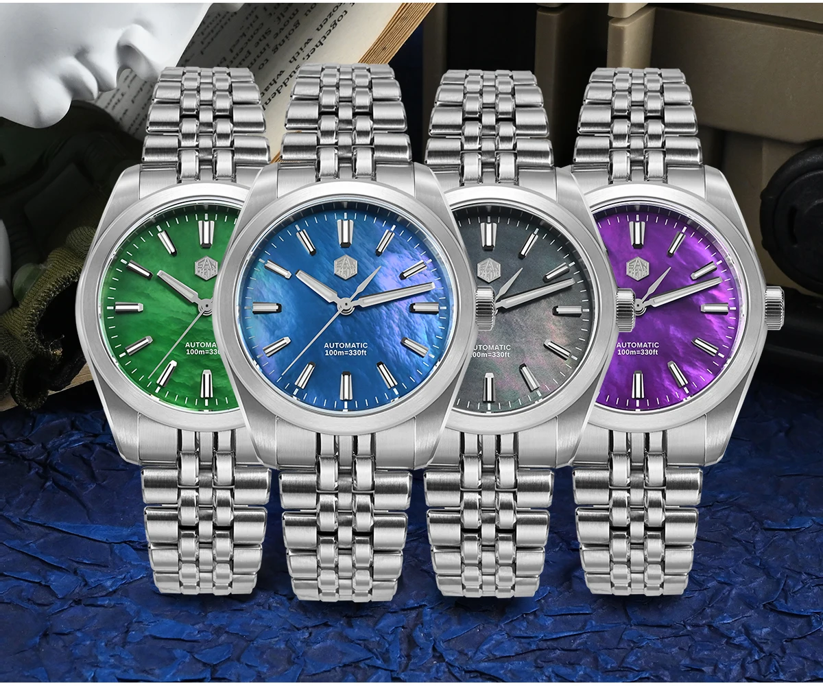 Dial Color: Natural Mother Of Pearl (MOP) Dial, Blue/Black/Green/Purple, With Applied Logo & Indices