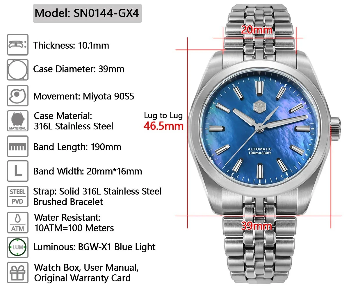 New 39mm MOP Dial Luxury Sport Gada Watch Miyota 90S5 Luxury Original Design SN0144-GX,