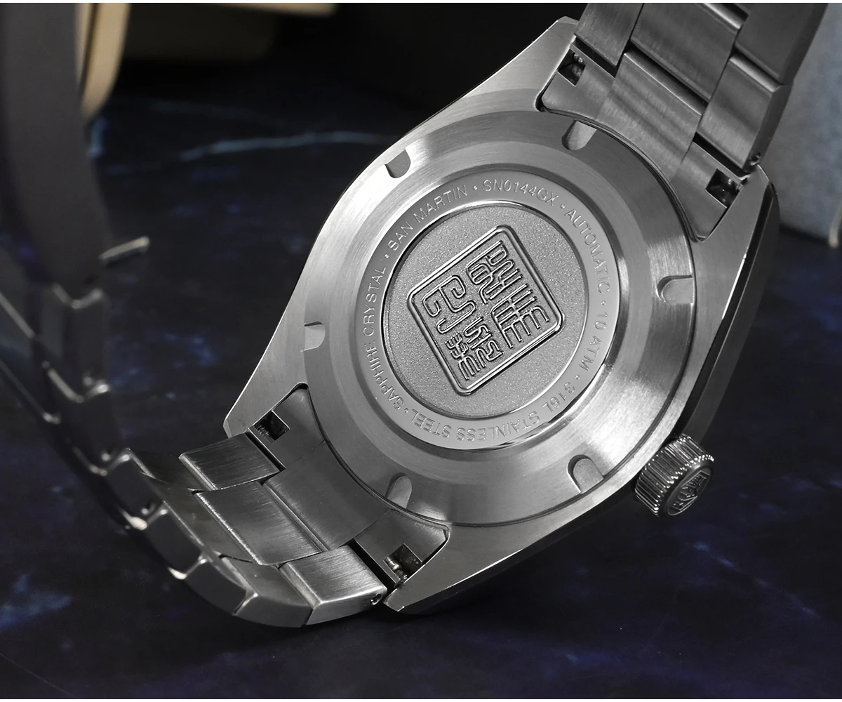 Case Back: Screw-down Case Back, Engraved with Chinese stamp "Made in San Martin", inspired by the stamp on the bottom of Chinese porcelain "JianZhan".