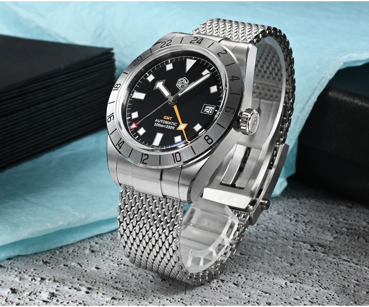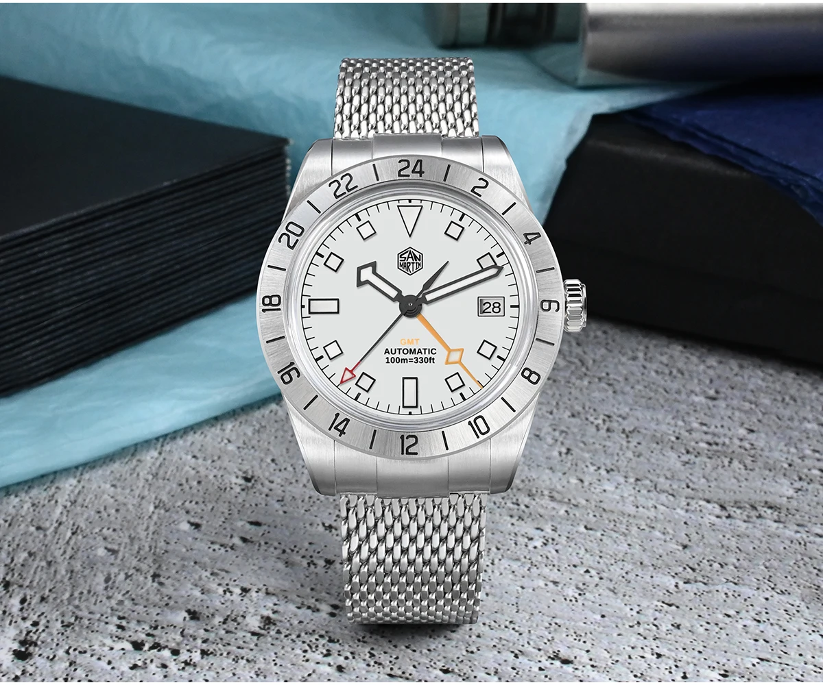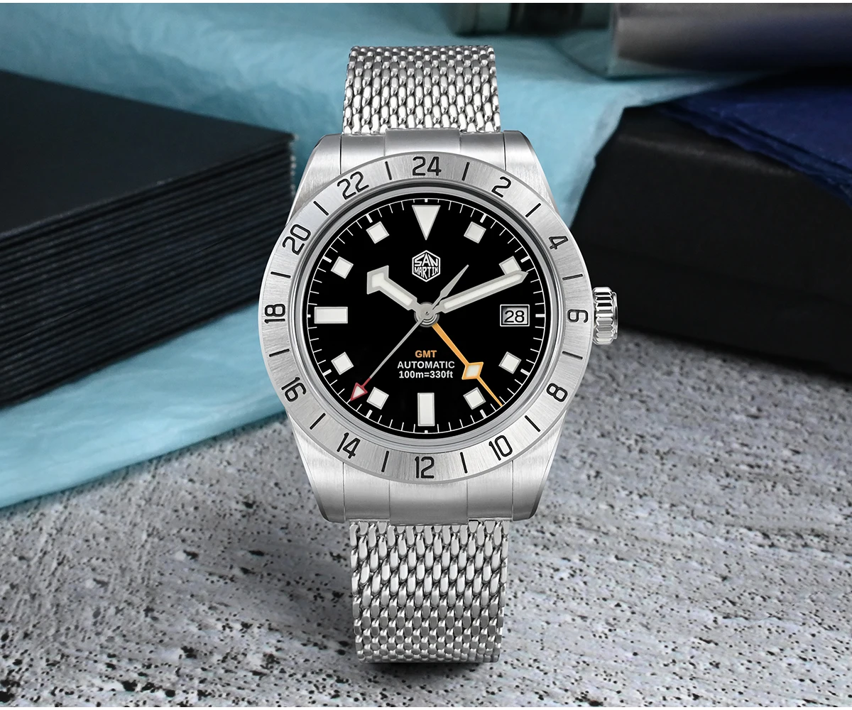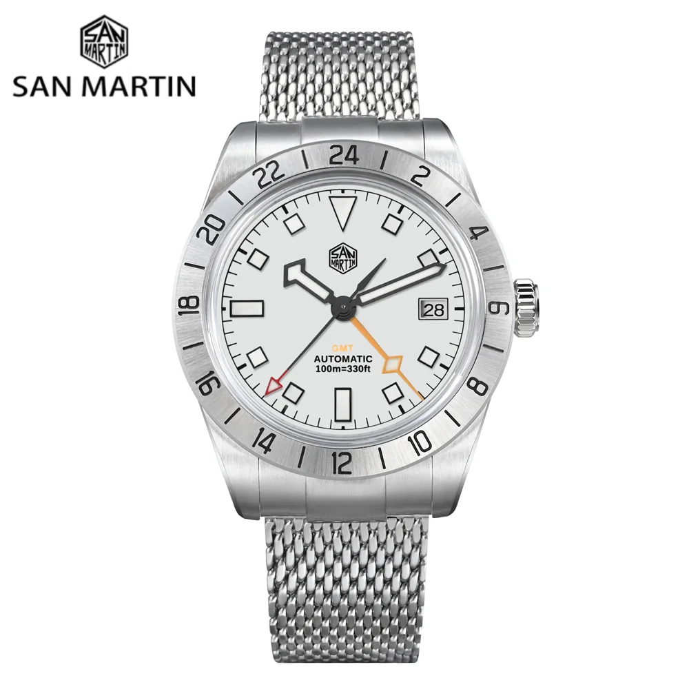 San Martin 39mm NH34 GMT Automatic Watch Luxury Wrist Clock Mesh Bracelet Quick Adjust Clasp 100m Waterproof Sapphire SN0135