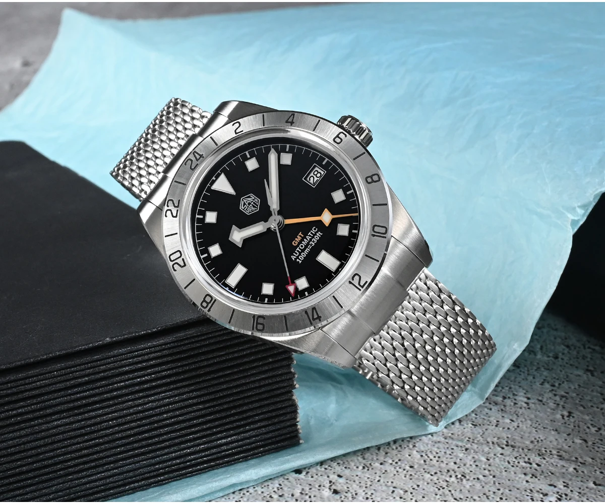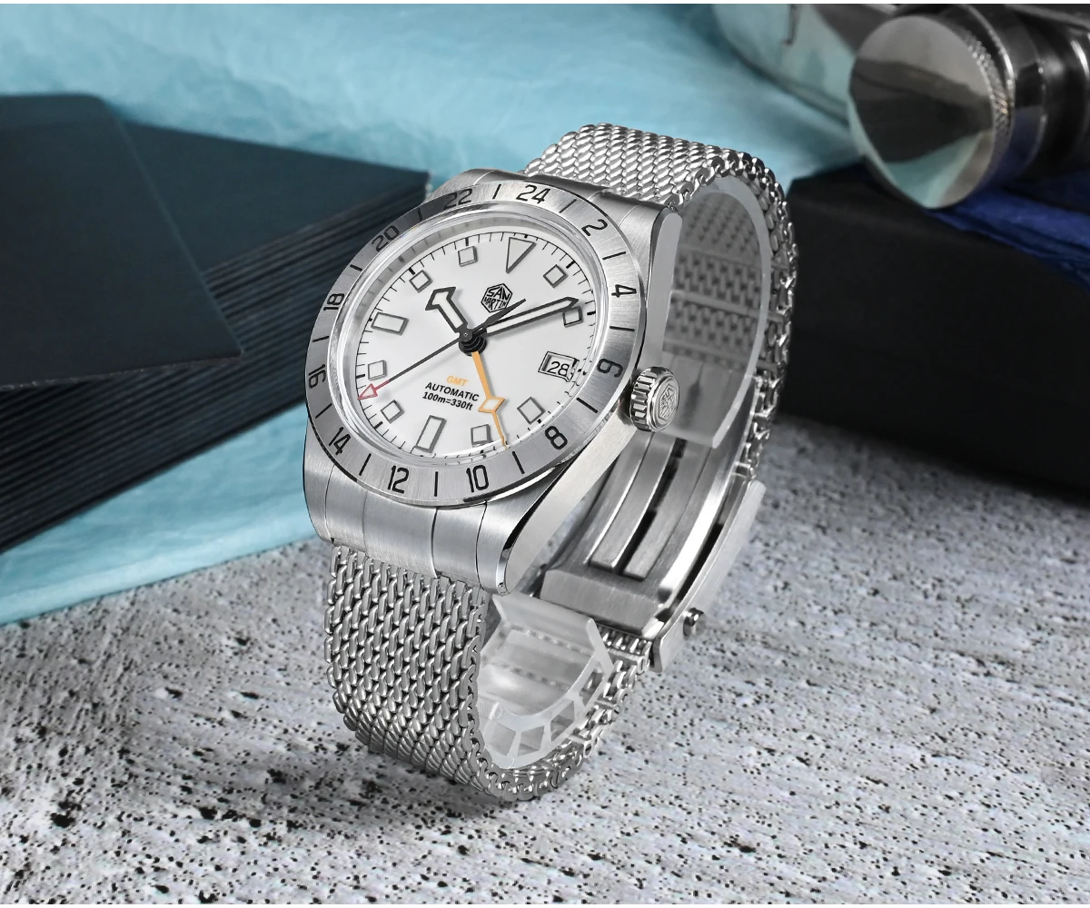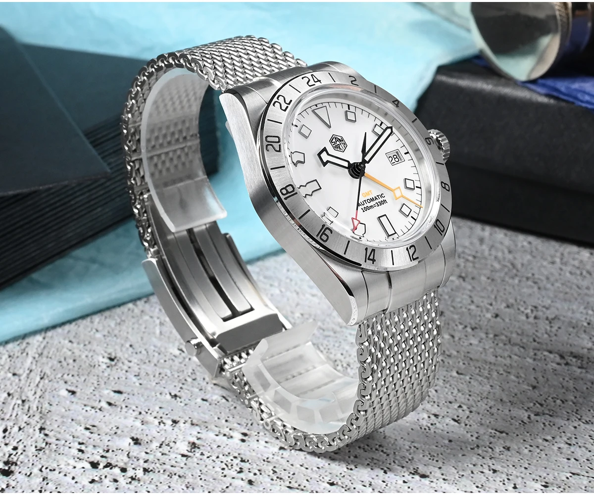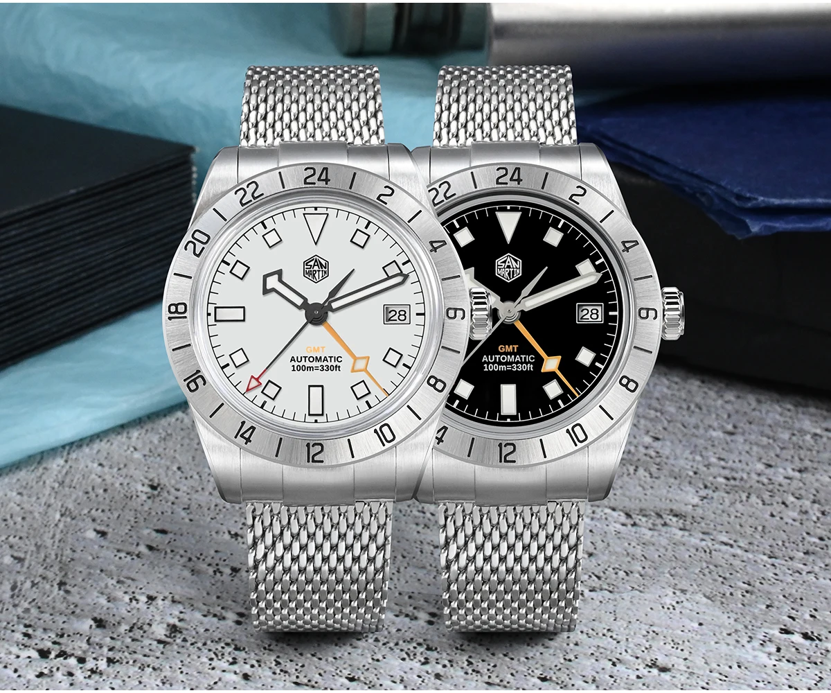 San Martin 39mm NH34 GMT Automatic Watch Luxury Wrist Clock Mesh Bracelet Quick Adjust Clasp 100m Waterproof Sapphire SN0135