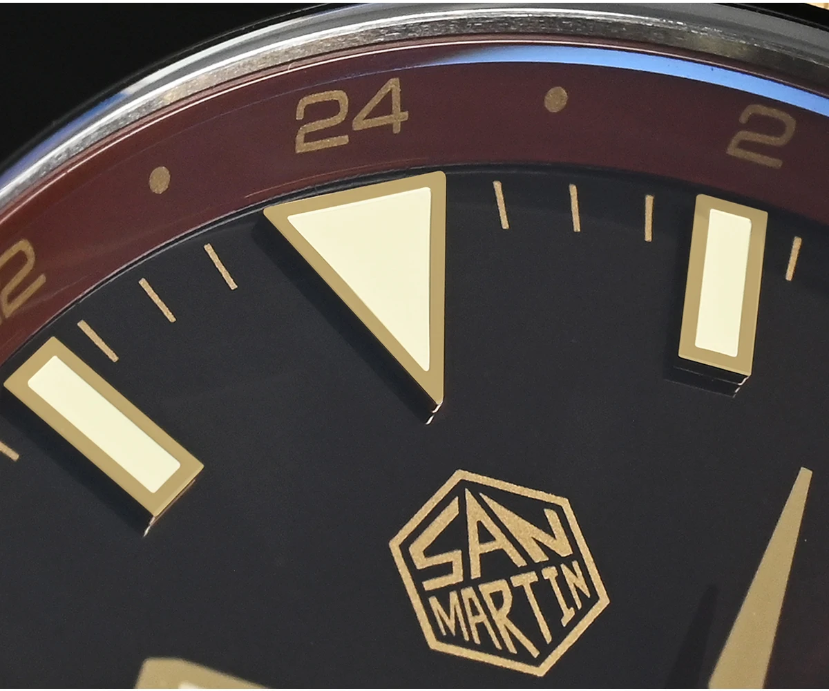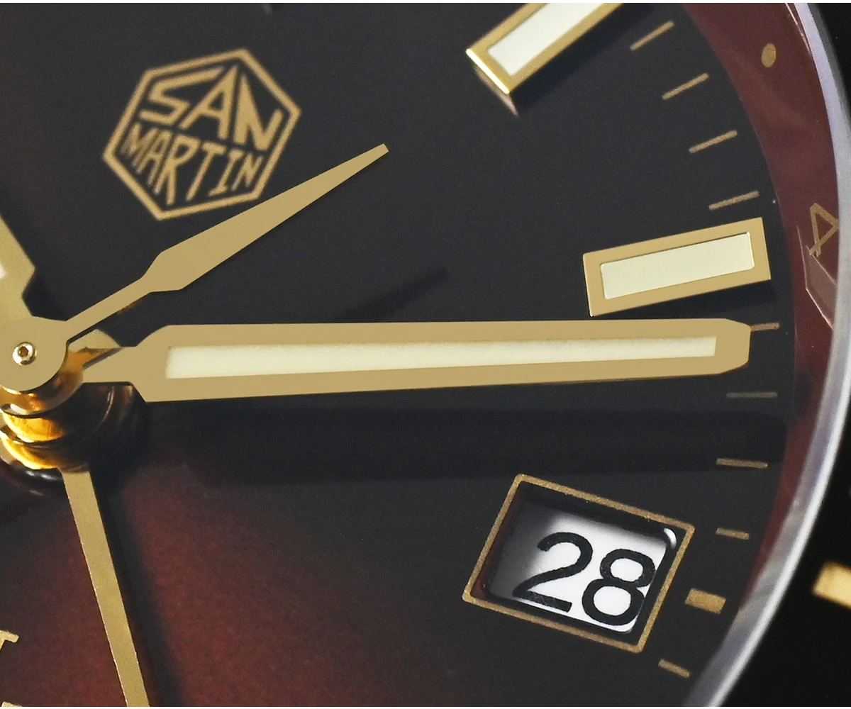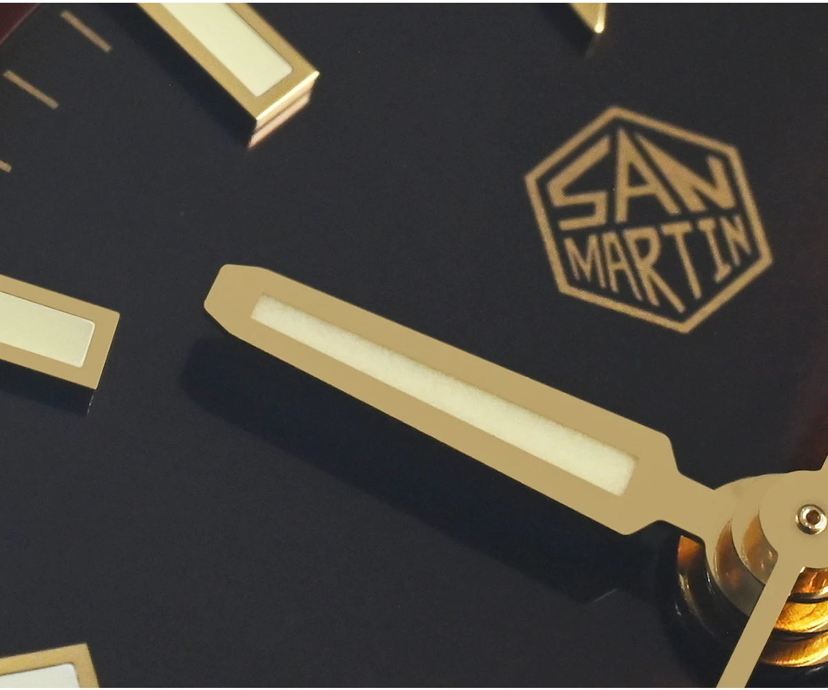 Dial: Enamel Sunray Brown Color, With Printed Hexagon San Martin Logo And Applied Indices, 3H Date Window