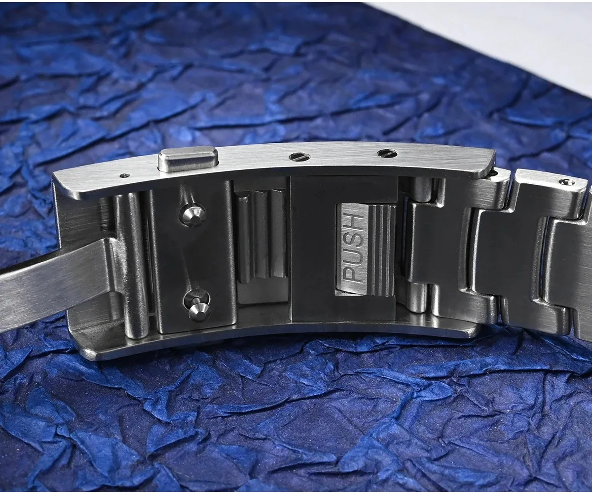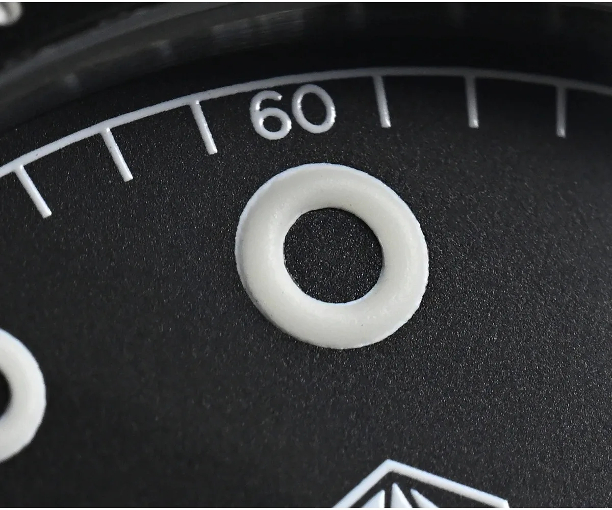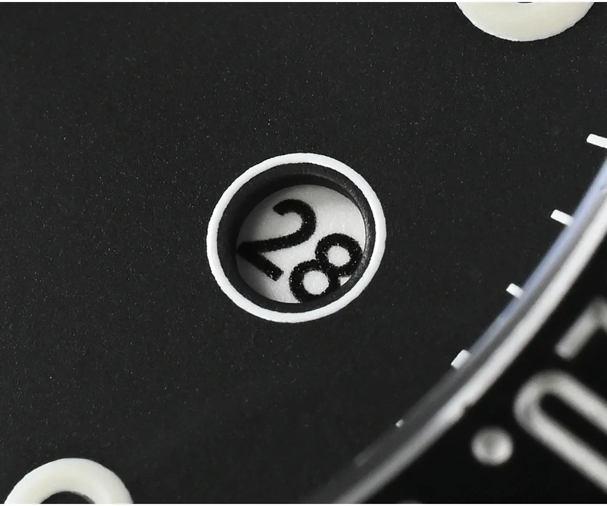 Dial: Sandblasted Black,Printed Hexagon Logo and Indices, Round Date Window at 4 O’clock
